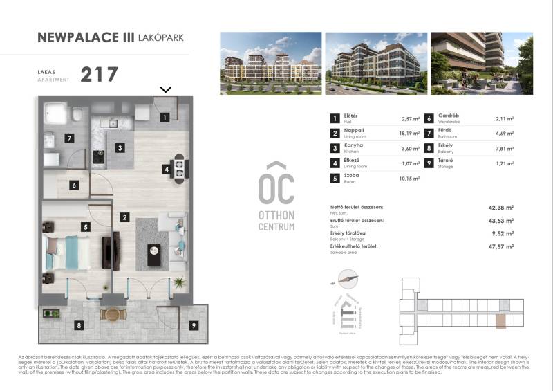 XIII. kerület – New Palace Lakópark III. ütem2. emelet | 42,38 m² | 9,52m² erkély | 2 szoba | 2026 év végén költözhető | 5% ÁFA visszaigényelhető a vételár egy részébőlModern, világos, energiatakarékos lakás eladó a Duna Plaza közvetlen közelében, dél-keleti fekvéssel, belső kertre néző erkéllyel, Prémium nyílászárókkal, mennyezeti hűtés-fűtéssel, alacsony rezsivel, Nyugodt környezetben, mégis minden karnyújtásnyira van: bevásárlás, sport, parkok, Váci úti irodafolyosóKözlekedés kiváló:M3-as metró, buszjáratok, Újpest vasútállomás, gyors kijutás az M3-as autópályára.Kötelező teremgarázshely vásárlás: 7.500.000FtIdeális otthonnak vagy befektetésnek a XIII. kerület legdinamikusabban fejlődő részén!