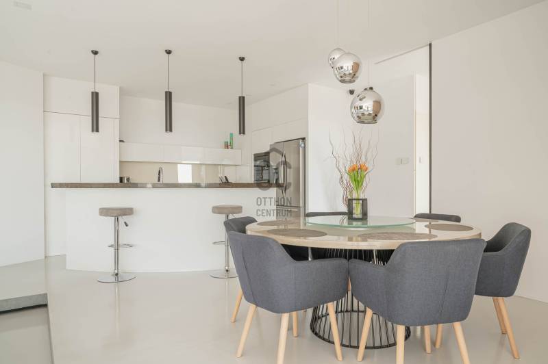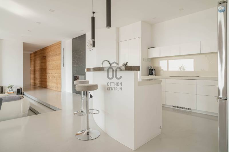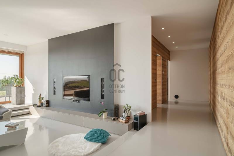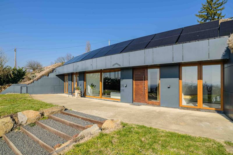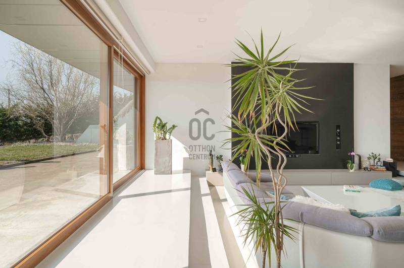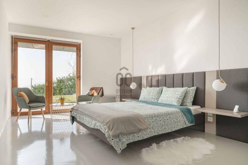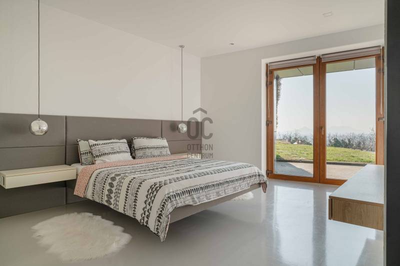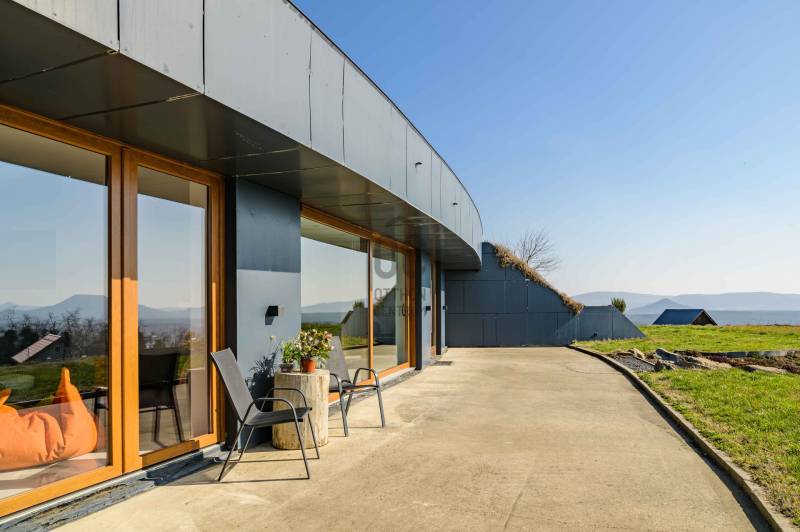 Zalahaláp zártkerti részén vált eladóvá a hirdetés tárgyát képező különleges és egyedi kialakítású családi otthon.Az épületet - a telek domborzati adottságait figyelembe véve - korszerű építészeti megoldásokkal kivitelezték 2017-ben.Falazata Leier egyedi gyártású kéregfal elemekből áll. 3 oldalról földbe süllyesztett, homlokzati frontja letisztult és 180 fokban nyitott a nagy üvegfelületeknek köszönhetően, így az épület egészéből mesés rálátást kapunk a környező tanúhegyekre.Hasznos alapterülete 200 négyzetméter, de a lejtős terepen történt kiépítés okán a ház nagysága ellenére mégis harmonikus kapcsolatot teremt környezetével.A zöldtető kialakítása nemcsak esztétikai, de ökológiai szempontból is fontos alkotóelem: javítja a hőszigetelést és vizuálisan is egyesíti az épületet a tájjal.A lakótér belső elosztása: előszoba, étkező - konyha - nappali, fő hálószoba - gardrób és fürdőszoba, 2 hálószoba, fürdőszoba, külön Wc - kézmosó, háztartási helyiség, gépészet és tároló. Ezt az életteret toldja meg az épület előtt elterülő 70 négyzetméteres teraszrész és a hozzá tartozó plusz zöldfelület.A belső kialakítás letisztult, nyugodt, modern formavilágú. A hatalmas üvegfelületetknek köszönhetően a ház egésze rendkívül világos.A panoráma és a természetes fény együttese tágasságérzetet ad, a belső kialakítás pedig otthonosságot teremt.A levegő hőmérsékletéről és keringetéséről geotermikus passzív szellőzőrendszer gondoskodik, ezt egészíti ki az elektromos padlófűtés és a nappaliban kiépített fatüzelésű kandalló is a hidegebb napokon.A kiépített 8Kw-os hybrid/off grid napelemrendszerrel és a hozzá tartozó 10Kw-os energiatárolóval minimalizálták a rezsiköltséget a tulajdonosok.Az épület vízellátása fúrt kútról biztosított (bevizsgáltatott, ivóvíz minőségű vízzel), a szennyvíz elvezetéséhez pedig egy 10 m3-es gondozásmentes szennyvízrendszert telepítettek.(A vezetékes víz felvezetése is folyamatban van)A terület egésze parkosított, gyümölcsfákkal és dísznövényekkel telepített. A kert teljesen zárt, több autó egyidejű parkolására is megoldható, valamint egy tárolóval kiegészített, 60 négyzetméteres két férőhelyes, fedett autóbeálló is kialakításra került.A terület nagysága és kialakítása elegendő helyet biztosít egy nyári konyhának, gyermek játszótérnek, vagy akár egy épített medencének is!Az épület teljes bútorzattal eladó.Ajánlom mindazok figyelmébe az ingatlant, akik a \"béke szigetét\" keresik távol a mindennapoktól. A családi ház tökéletes állandó lakhatásra és nyaralónak is!Amennyiben kérdése merülne fel az ingatlannal kapcsolatban vagy szeretné azt megtekinteni, kérem keressen a megadott elérhetőségek egyikén!Az adatok kizárólag a megbízóink által rendelkezésünkre bocsátott információkon alapulnak.Fentiekre tekintettel, az adatok teljességéért, helyességéért és aktualitásáért nem vállalunk felelősséget.Az árváltozás, adatmódosítás és közbeni értékesítés jogát fenntartjuk, mindezekért jogi felelősséget nem áll módunkban vállalni.