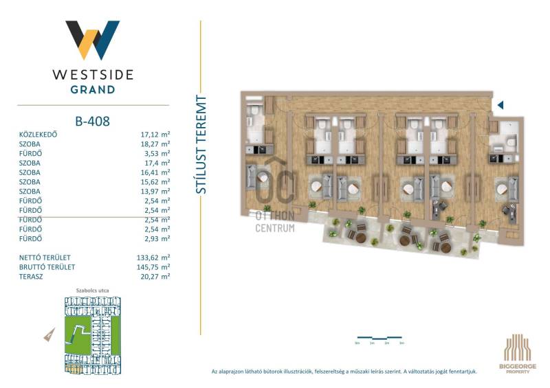 Projekt bemutatásaA PROJEKTRŐLA Westside Grand I-II. a Biggeorge Property Westside fejlesztés sorozatának - a Westside Residence és a Westside Gardent követően - legújabb tagja.LOKÁCIÓBudapest egyik leggyorsabban fejlődő kerületének központi területén, a XIII. kerületben, a Városligettől és a megújuló Nyugati pályaudvartól sétatávolságra épül. A Nyugati pályaudvar környéke az elkövetkezendő években szinte teljesen megújul, a XIII. kerületben elhelyezkedő Szabolcs utcában, illetve közvetlen környezetében számos új építésű ingatlan épült, melyek jelentős értéknövekedést kínálnak a környéken ingatlant vásárlóknak. A több ütemben megvalósuló lakóingatlanfejlesztések hatalmas zöld parkot ölelnek körül, így a lakók akár az erkélyen ülve is élvezhetik a csendet, nyugalmat és zöld környezetet egy központi, belvárosi környezetben is.