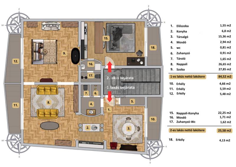Budapest I. kerületében, a Naphegyen keresi új tulajdonosát egy két teljesen külön bejáratú lakássá alakított igényes ingatlan. A nagyobb lakás 84 m2-es lakótérrel és 3 db összesen 16 m2-es erkéllyel rendelkezik, a kisebb lakás 28 m2-es és 4 m2-es Várra néző panorámás erkéllyel rendelkezik. Mindkét ingatlan világos terekkel rendelkező, örök panorámás otthon. Ha NÍVÓS KÖRNYÉKEN szeretné megtalálni új otthonát, értékeli a zöld környezetet és a belváros közelségét, akkor ezt a különleges lakást feltétlenül nézze meg! A Naphegyen ritkán adódik olyan lehetőség, ahol egy ingatlanon belül két külön lakás nyújt egyszerre otthoni kényelmet és befektetési potenciált.** KÖRNYÉK ÉS KÖZLEKEDÉS **- I. kerület, Naphegy, KÖZPONTI elhelyezkedésű CSENDES utca.- Átmeneti zóna a Gellérthegy természetesebb, zöld részei és a Naphegy városiasabb, infrastruktúrában gazdag területe között.- PRÉMIUM TERÜLET, a Gellért park, Hováth-kert, a Czakó kert és a Déryné közvetlen közelében.- A helynek van történelmi és esztétikai értéke is, ami plusz élményt ad a hétköznapokban.- A lakástól néhány perc alatt elérhető minden, ami a hétköznapokhoz szükséges.- Közelben bölcsőde, óvoda, Kormányablak, Önkormányzat, gyógyszertár, posta, bankok és szolgáltatók sokasága.- A Gellérthegy kiváló hely sétákra, kirándulásra, sportolásra ott a Tabán, az Oxigén wellness és a kerületi lakosoknak díjmentes Czakó Szabadidőközpont.- A közlekedés jól kiépített a környéken, a Dózsa György Tér, Naphegy Tér, Krisztina Tér – autóbuszokkal, villamossal, metróval is elérhető.- A Krisztina téri közlekedési csomópont és a Dózsa György tér a lakástól 3 perces sétatávolság, így a belváros is könnyen megközelíthető.- Parkolás szempontjából a környező utcák mindegyike fizető övezetes, de bejelentett lakcím esetén, kerületi parkoló kártya éves ötezer forintért kiváltható.** AMIT A HÁZRÓL TUDNI KELL **- 1960-ban épült, 8 lakásos, rendszeresen karbantartott társasház.- Korai modern stílusú, szépen KARBANTARTOTT ÉPÜLET külső és belső homlokzata jó állapotú, lépcsőháza rendezett.- A ház műszakilag is karbantartott.- Lakóközössége barátságos, befogadó, családias közösség.** MIÉRT IDEÁLIS VÁLASZTÁS? **- Második emeleti, ritka adottságú, összesen 112 m2-es lakótérrel és 4 db, összesen 20 m2-es erkéllyel rendelkező, Várra néző örök panorámás ingatlan.- Egy helyrajzi egységen belül két külön használható lakás, ami ritka és sokféle vevői igényt lefed.- Hasznosításban nagyfokú rugalmasságot kínál a 84 m²-es, tágas főlakás és a 28 m²-es, külön bejáratú kisebb lakás.- Az elrendezés ideális lehet többgenerációs együttélésre, otthon és munka kombinálására, vendéglakás kialakítására, vagy befektetési célra is.- A nagyobb lakást egyedi mennyezeti és falfestések, gránit és márvány pultok díszítik, amik magas minőséget képviselnek.- A garzon lakás berendezése egyszerű, letisztult design.- Tájolása nyugati, hatalmas fából készült nyílászáróinak köszönhetően az élettér jó fényviszonyokkal rendelkezik.- A nagyobb lakás felosztása: előszoba, háztartási helyiség, fürdőszoba, konyha, étkező, nappali és hálószoba, plusz 3 db erkély.- Az egyedileg tervezett és gyártott, gránit munkalapos konyhabútor a lakás stílusának megfelelő dizájnnal rendelkezik.- Modern konyhagépekkel, egyedi pultba épített hűtőkkel felszerelt, minden igényt kielégít.- A nagyobb lakásban a fürdőszoba hidegburkolattal a többi helyiség elegáns és időtálló, fa parkettával burkolt.- A kisebb lakás felosztása: előszoba, fürdőszoba, konyha, szoba, 1 db erkély.- A garzon lakás fürdőszobája hidegburkolattal a többi helyiség laminált parkettával burkolt.- A kétrétegű, hőszigetelt, fából készült nyílászárók könnyen mozgathatóak.- Minden helyiségben elektromos padlófűtés lett kialakítva, ami egyenletes hőmérsékletet biztosít a hidegebb napokon is.- Az étkező részben egy hűtő-fűtő klíma is rendelkezésre áll.- A két lakás közös költsége 55 000 Ft/hó, amely tartalmazza a vízdíjat, lépcsőház takarítását és a szemétszállítást is.- A lakásban található teljes beépített bútorzat a vételár részét képezi.- A társasház pincéjében lakásonként egy-egy 5 m2-es zárható tároló is tartozik.** AZ INGATLAN MEGTEKINTHETŐ **- Személyesen, előre egyeztetett időpontban,- 3D webséta segítségével, kényelmesen, akár otthonról is.** FINANSZÍROZÁSI KÉRDÉSEKBEN– ONLINE IS – SEGÍTÜNK **- Bank-független hitelcenterünk díjmentesen versenyezteti az összes bank és hitelintézet ajánlatát.- Önnek csak annyi a dolga, hogy egyeztet munkatársunkkal, majd kiválasztja a hosszú távon is legkedvezőbb konstrukciót.- Szakértőink 20 év tapasztalattal, fogyasztóbarát lakáshitelekkel, babaváró hitellel és teljes körű CSOK Plusz és OTTHON START program ügyintézéssel várják.- Időpont-egyeztetéssel munkaidő után is elérhetők.Ha egy stílusos, várra néző örök panorámás, különleges otthont keres prémium környéken — ami valóban más, mint a megszokott ’kirakatlakások’ — ezt érdemes személyesen is megismernie. Tágas, világos terek, egyedi alaprajz várja — zöldövezetben, mégis a belváros közelében. Kiváló választás lehet azok számára, akik együtt, mégis külön életteret keresnek, de befektetési szempontból is figyelemre méltó lehetőséget kínál, ne hagyja ki!Érdeklődés esetén VÁROM HÍVÁSÁT a hét minden napján! Kérdéseire szívesen válaszolok.